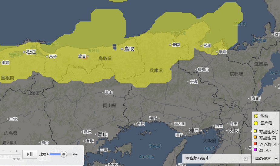 雨だけでなく、落雷の危険度や風の強さも、同様の地図インターフェースで確認可能です。特にゴルフや釣りなどの屋外アクティビティを行う方にとっては、安全管理のために欠かせない情報源となります。