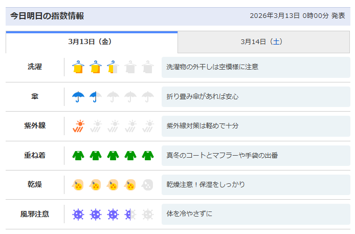 「服装指数」は一見地味ですが、季節の変わり目には非常に重宝します。今日着ていく服に迷ったら、この指数のアドバイスを信じて選ぶと失敗が少ないですよ。