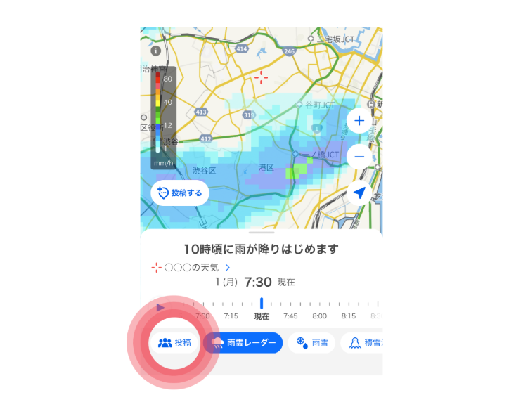 雨雲レーダーは地図を拡大して「自分の家の上」をピンポイントで見るのがコツ。予測アニメーションを最後までスライドさせて、雨の降り始めと止み際を数字でも把握しましょう。