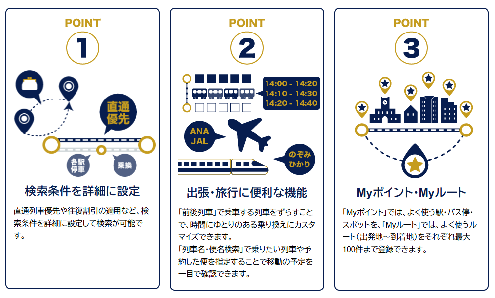 - Myルート・Myポイント: よく使う駅やルートを最大100件まで登録でき、ワンタップで検索可能になります。