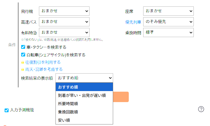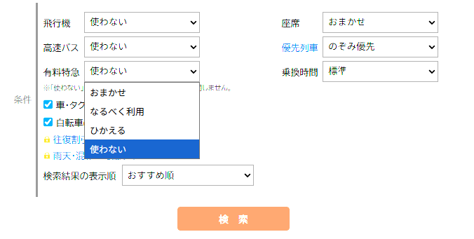「新幹線は使わない」「飛行機は検索から除外する」「有料特急は乗らない」など、利用したくない交通手段のチェックを外すことで、現状に合わないルートが表示されるのを防ぐことができます。