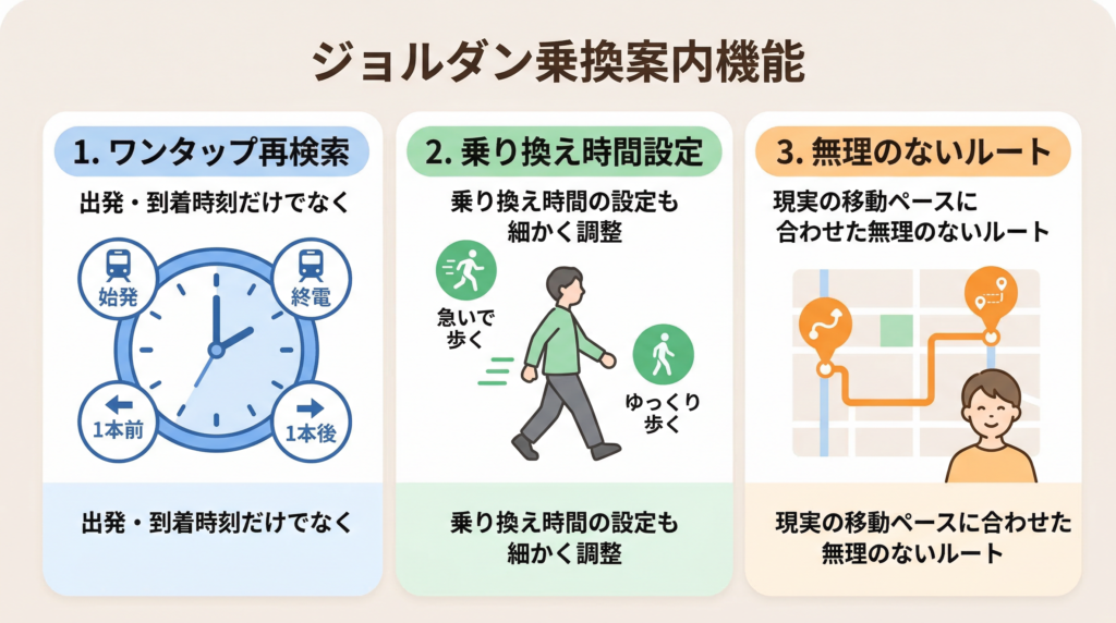 ジョルダンの強みは、都市部の複雑な地下鉄網から地方の路線バスまで、あらゆる日本の交通事情に深く精通している点です。「どうしてもこの時間に間に合わせたい」というシビアな場面で、一番頼りになる相棒になりますよ。