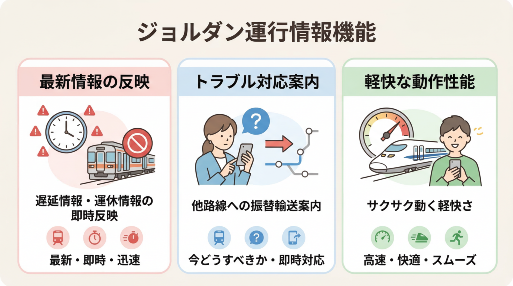 運行情報の反映の速さも大きな魅力です。最新の遅延情報や運休情報はもちろんのこと、他路線への振替輸送の案内など、トラブル発生時に「今どうすべきか」を瞬時に把握できる設計になっています。急いでいる時でもサクサク動く動作の軽快さも評価されています。